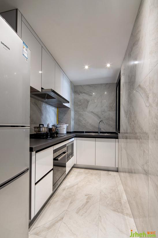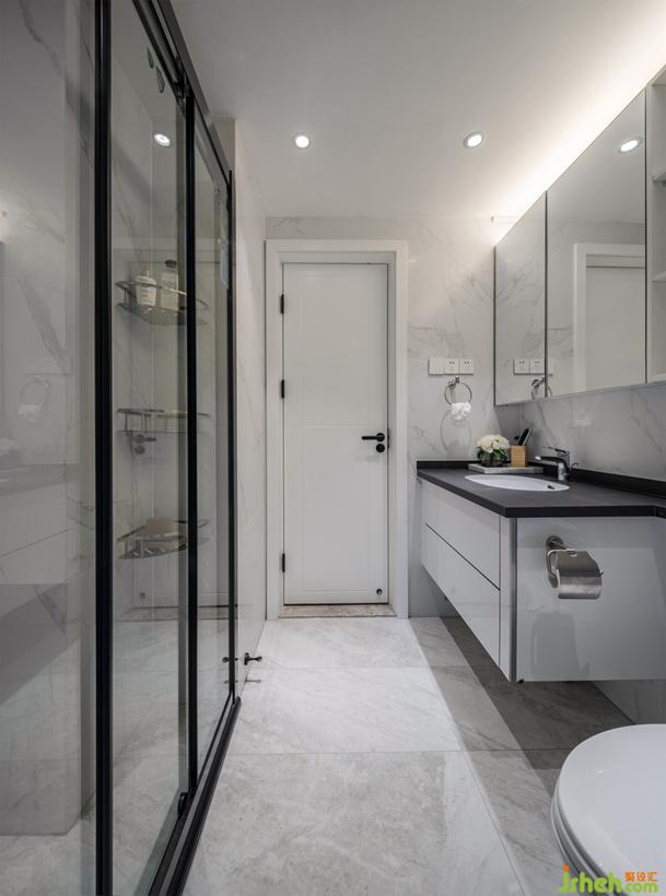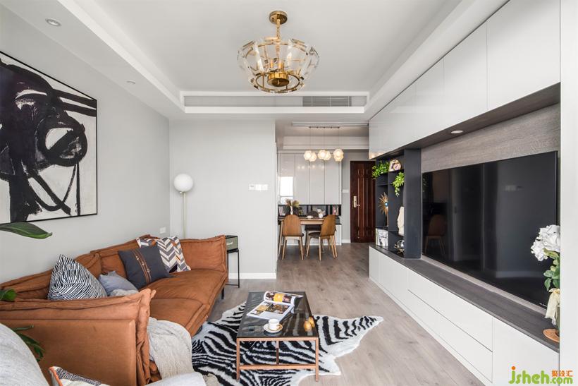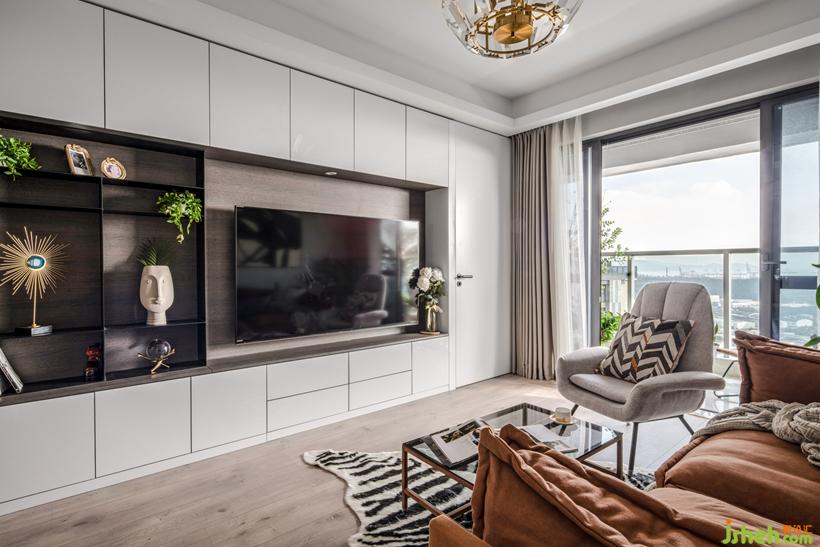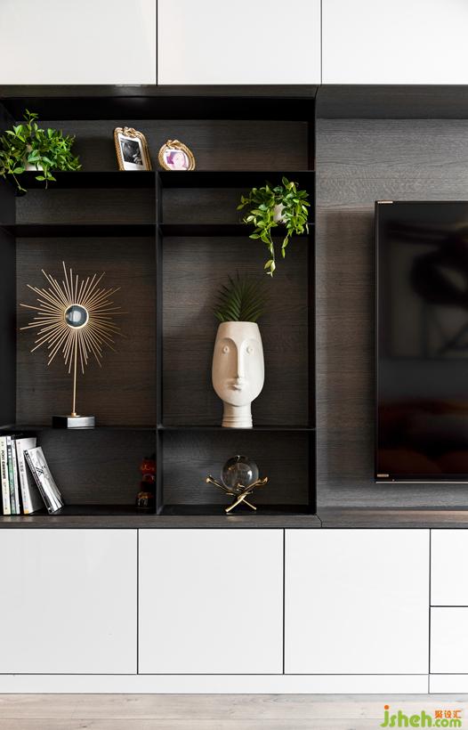 电视柜整合主卧门与设备,一路延伸转至玄关处,空间体量无限放大。
