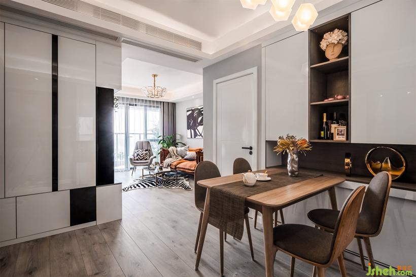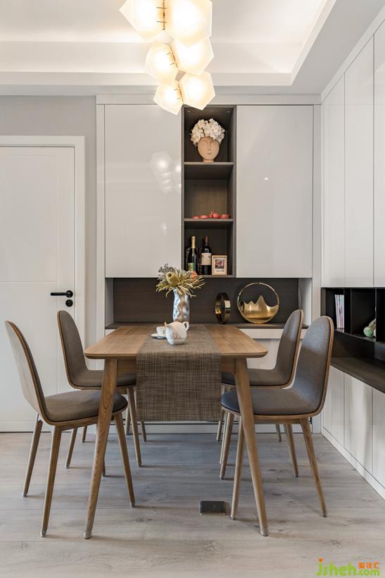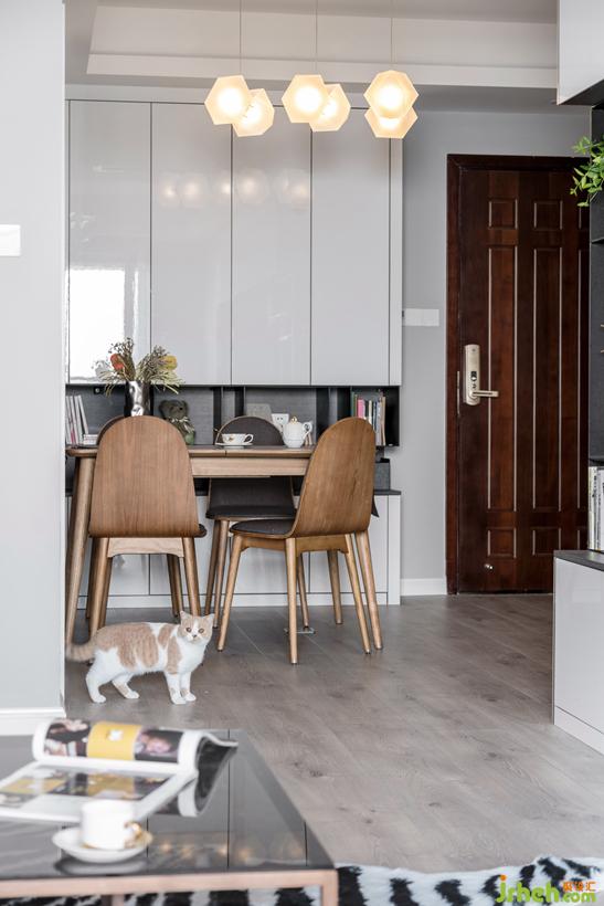 小户型福星,从次卧空间争取出餐边柜,柜体凹洞平齐餐桌,作为餐桌的延伸。桌旗由Sandy日本背回。
