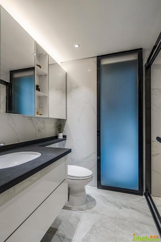 香水集中展示在开放格中,大理石台面的延续增加了置物功能。