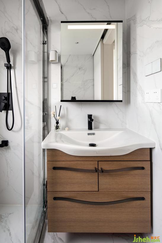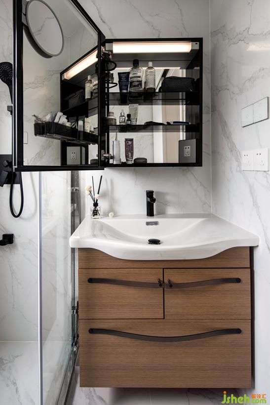 浴室柜多角度镜面设计,镜柜内外都有照明,可以环形检查自己的仪容。内部配有充电口,充电线不必从柜门夹缝中伸出,吊在半空充电。