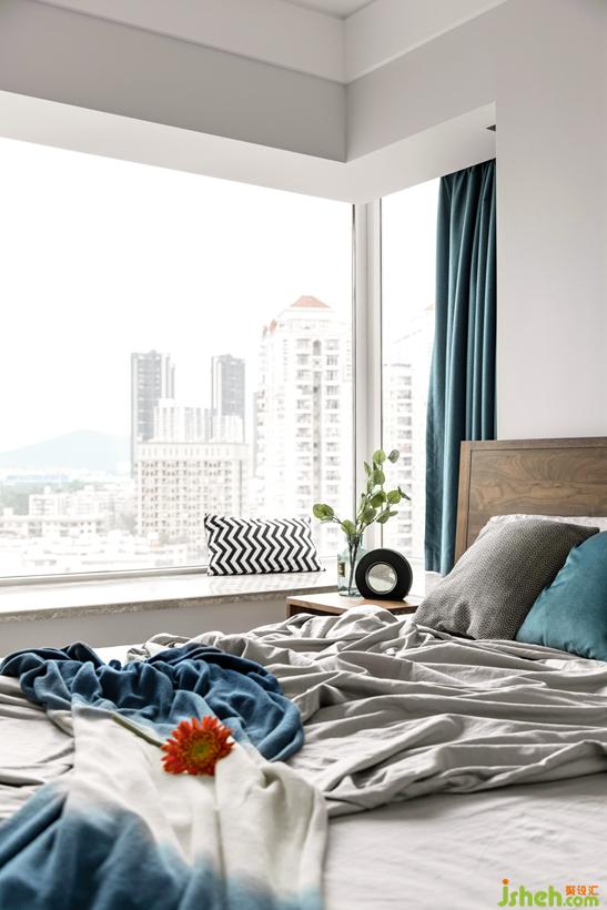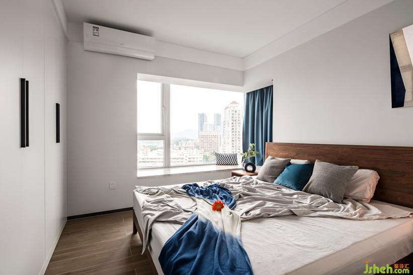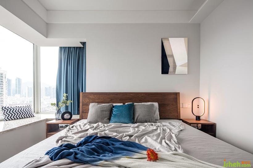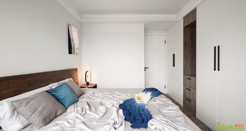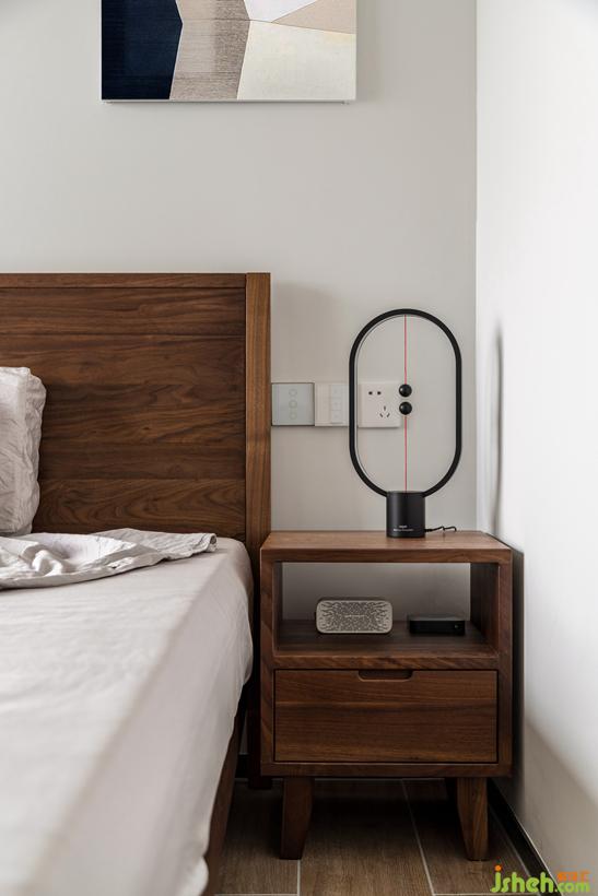 床头墙面积窄,用不对称的挂画,平衡视觉感。木质家具注入休闲与暖意,搭配出自然的触感。