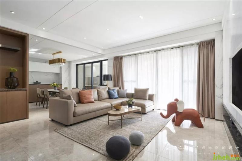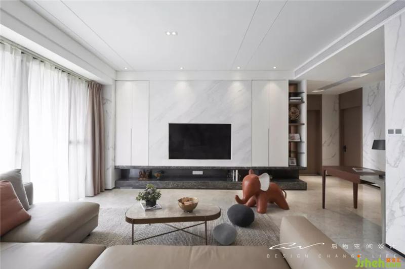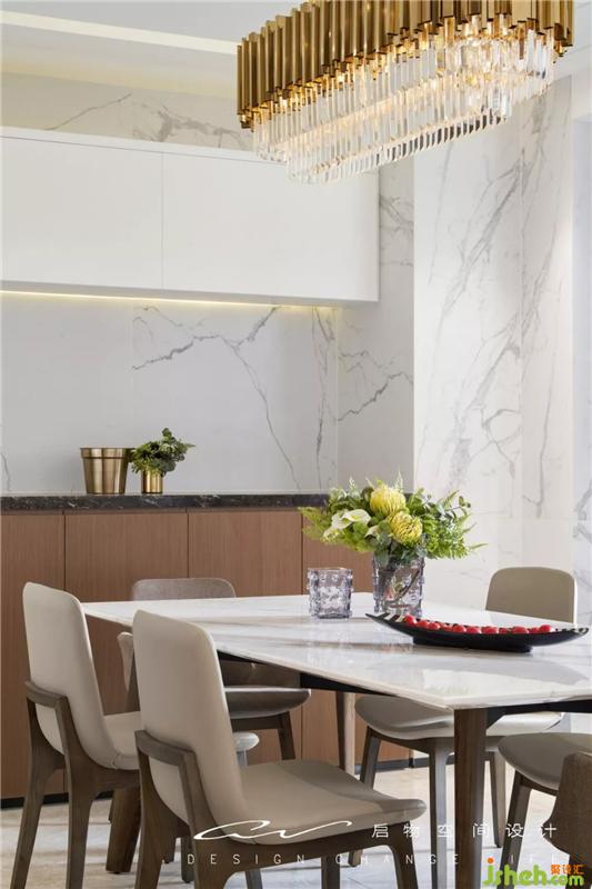 电视墙对称的设计更显庄重,挑空的柜体带来轻盈感。石材与不锈钢的收边是力量,侧边茶灰镜带来通透感。装修设计