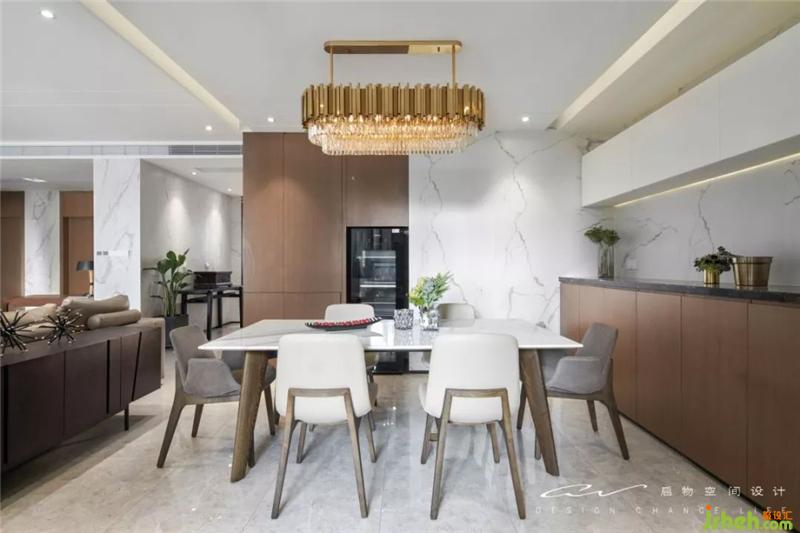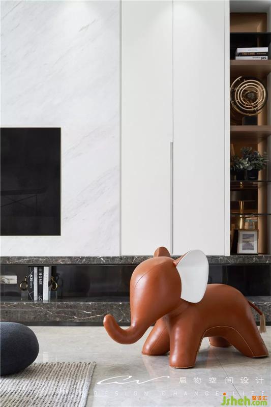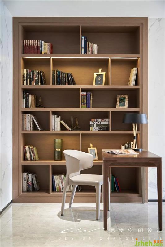 左边从书房区走向卧室空间,右边为玄关区。将硬装的基底做到够,再用少量的软装点缀,无需堆砌就能发散出大宅的气魄。装修设计