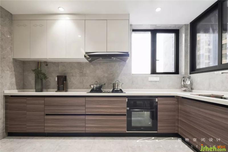 原厨房仅有的一扇窗户,不足以支撑大厨房的采光。我们将与阳台接壤的墙面重新开拓出新窗。才得到现在的明亮感,木色的横纹与黑色元素带出硬朗的极简氛围。右侧冰箱还未入场。