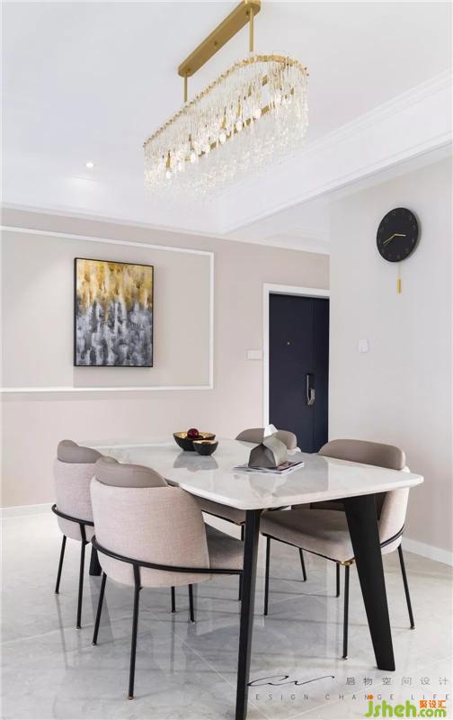 吊灯的璀璨与挂画的斑斓一脉相承,金色是他们共有的语汇。在墙上的挂钟,在桌上的果盘,在餐椅的腿上。装修设计