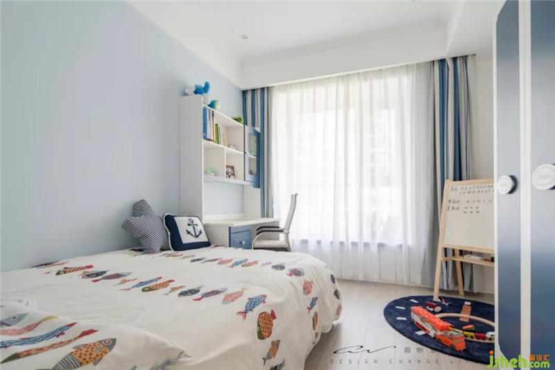 墙面的蓝白拼色,窗帘,衣柜,透露出童趣。有点违和的书桌椅是sheerry刻意为之,这里不要太舒服,写作业时就认真写。房间格局调整后,空出钢琴位,现在沦为小男孩的玩耍区。实现一张一弛的平衡。