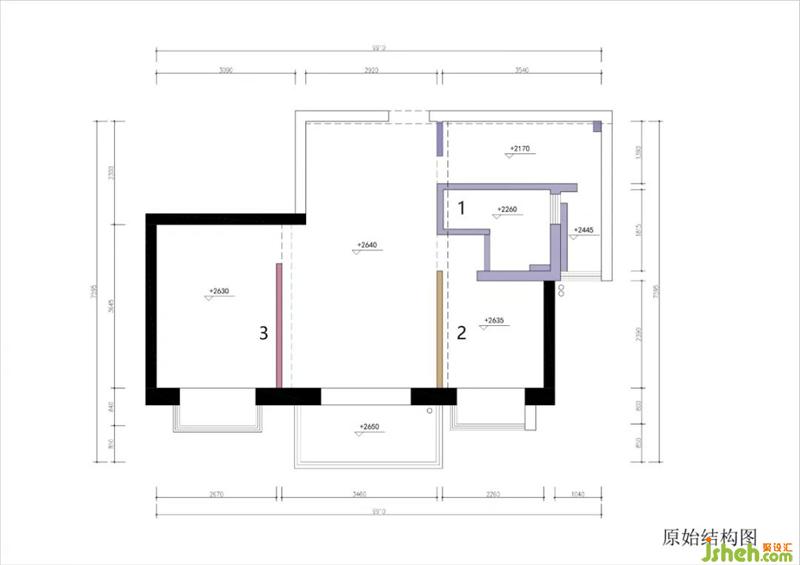 粉色区:这堵墙很尴尬。挤到了主卧,切散了客餐厅,留下奇怪的凸角。装修设计