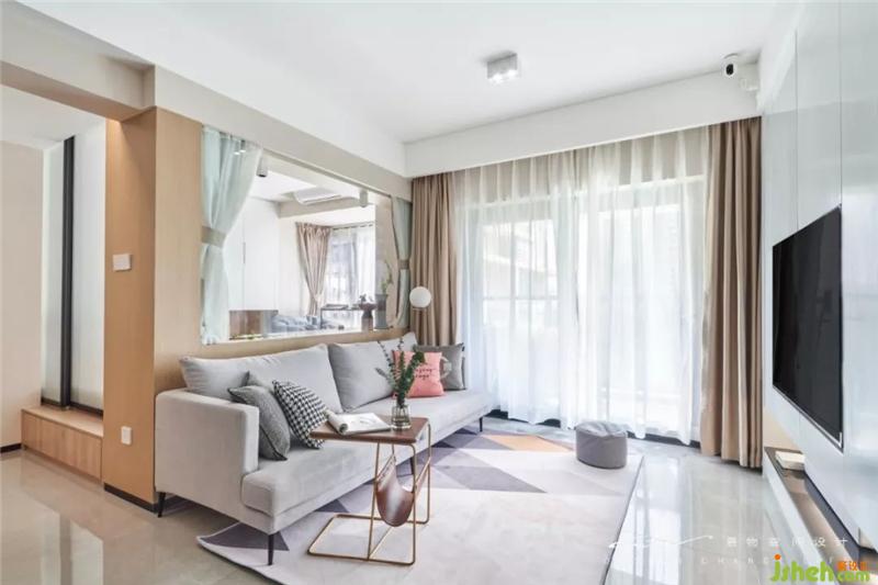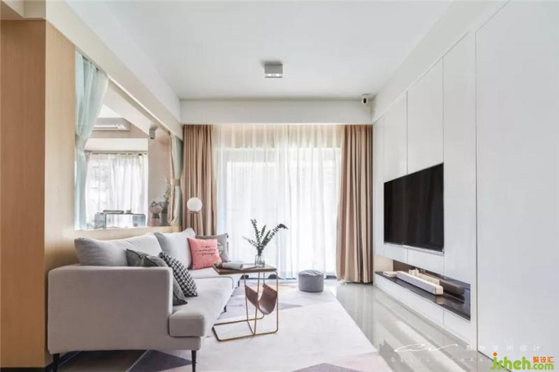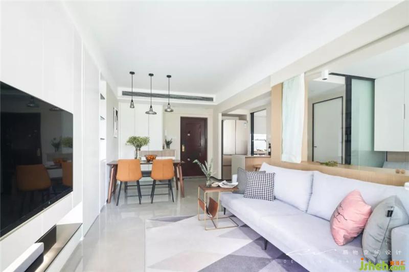沙发挑了很久才找到尺寸刚刚好的,灰色的布料,串联地毯的灰调,再用一块粉色妆点活泼。装修设计