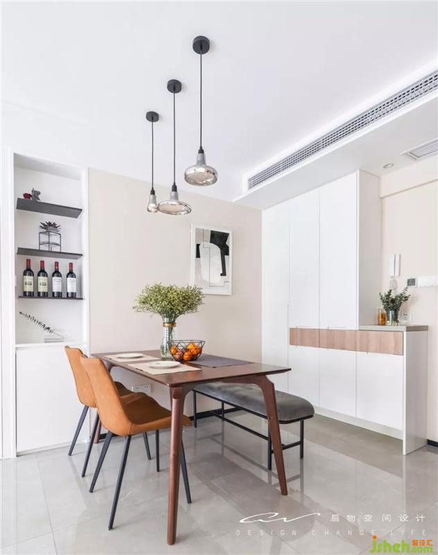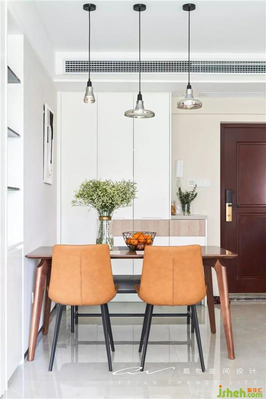 两张驼色餐椅,搭配灰色长条凳,组合更灵动。烟灰色的玻璃吊灯点燃家的感受。装修设计
