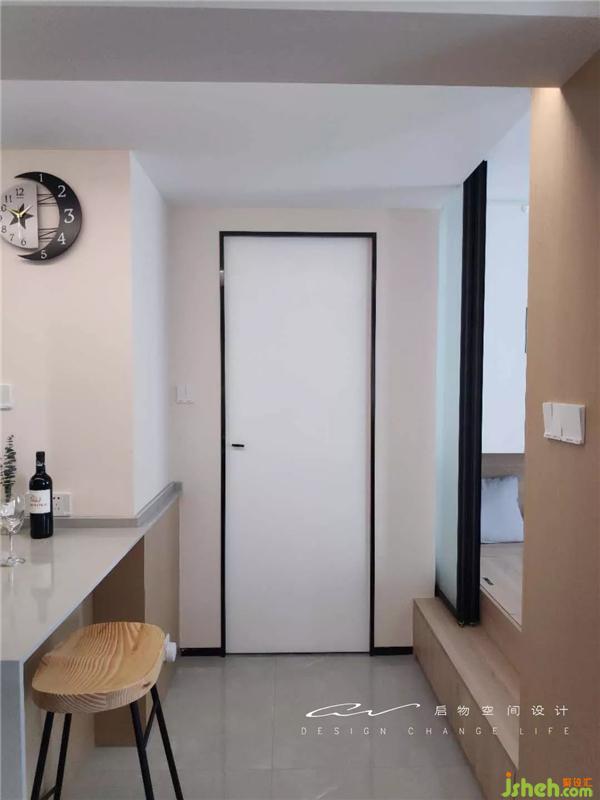 门由木工师傅现场打造,一指节的门套提升精致度。多功能房推拉门直接做在榻榻米台阶上。