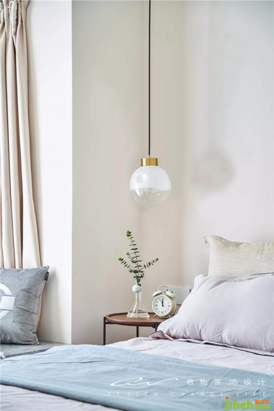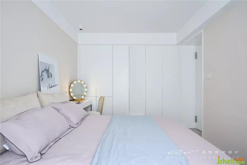 藕粉色的床品,搭配雾蓝色的盖毯,温姐粉色的心大满足。梳妆台是网红款。