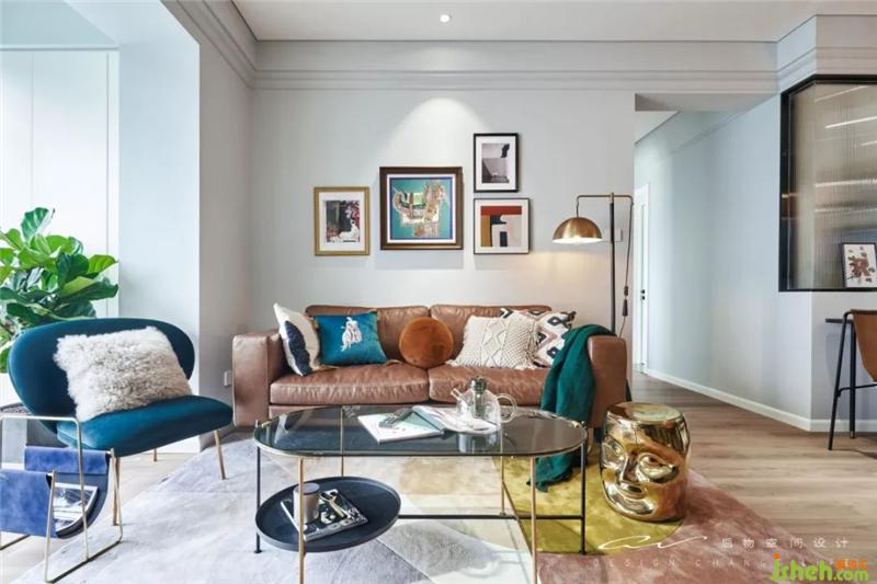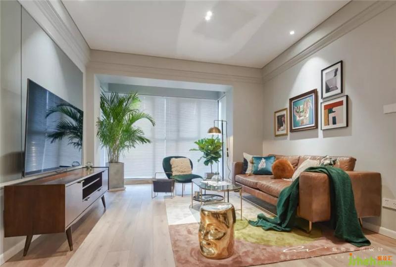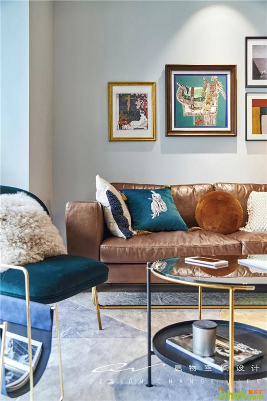灰色墙面和浅色地板为基调,墨绿色的边椅和姜黄色的地毯为点缀。 茶几玻璃通透,挂画复古别致,再加点金属的元素,交织复古西洋风的气质。装修设计