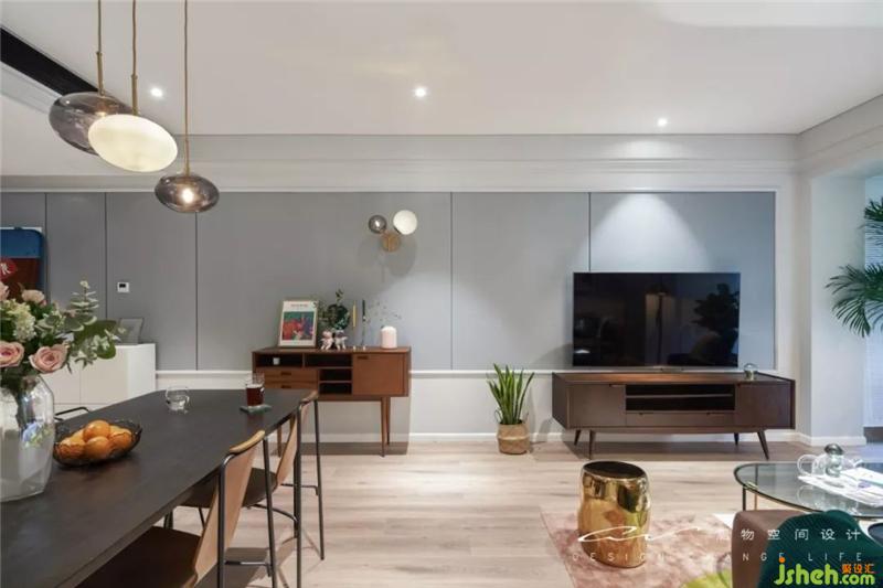 墙面线框区隔两种灰度、两种味道 。留缝线条像音乐的节奏、深深浅浅。墙漆直接刷过天花线条,显层高,也更整体。