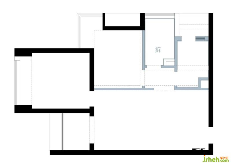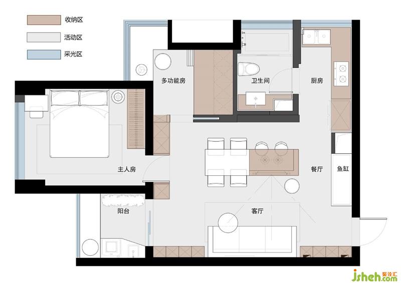 重新规划后如图,整个案例的思路是: 1.(敲重点!)用柜子来形塑空间。2.(敲亮点!)客餐厅非常规的布局。消灭了纯过道。
