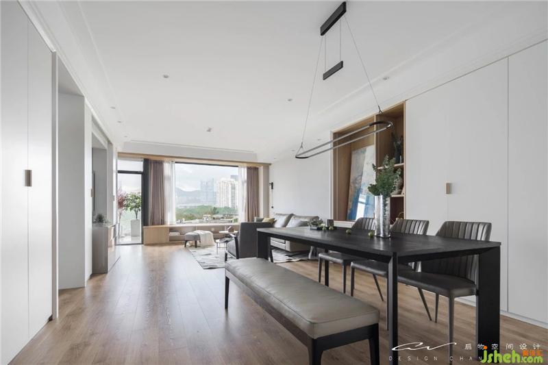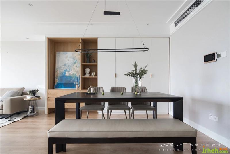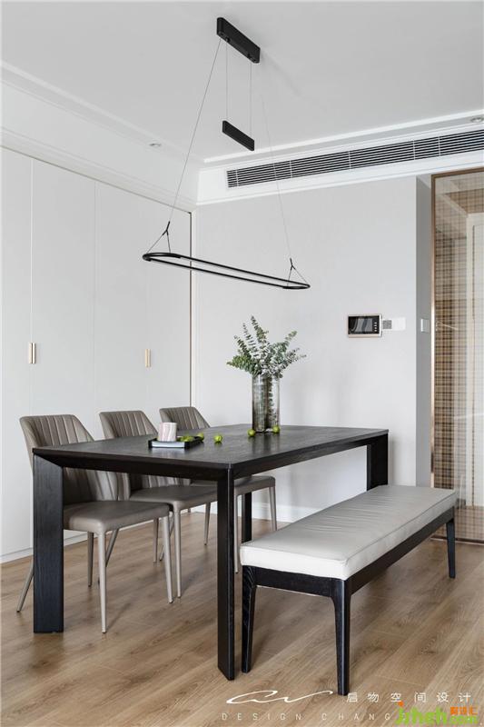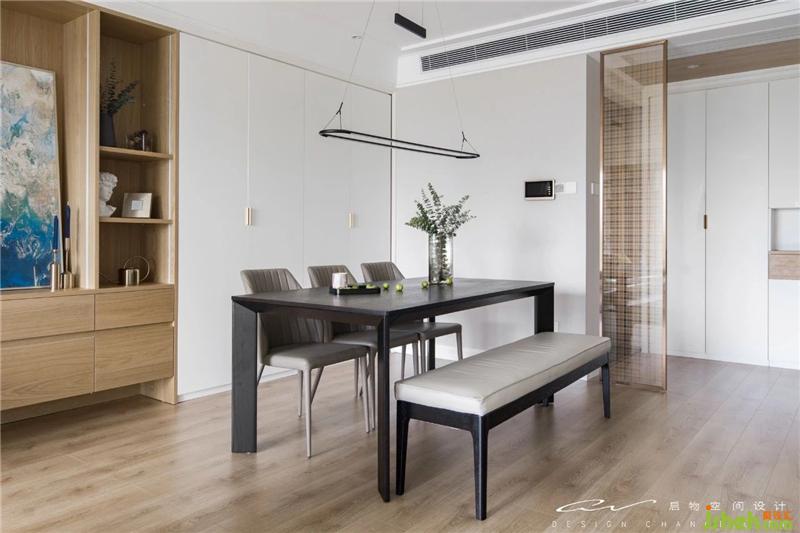 吊灯造型简洁,高度不依赖电工师傅,可以手动调节。餐边柜辅助餐桌收纳,展示小物件。装修设计