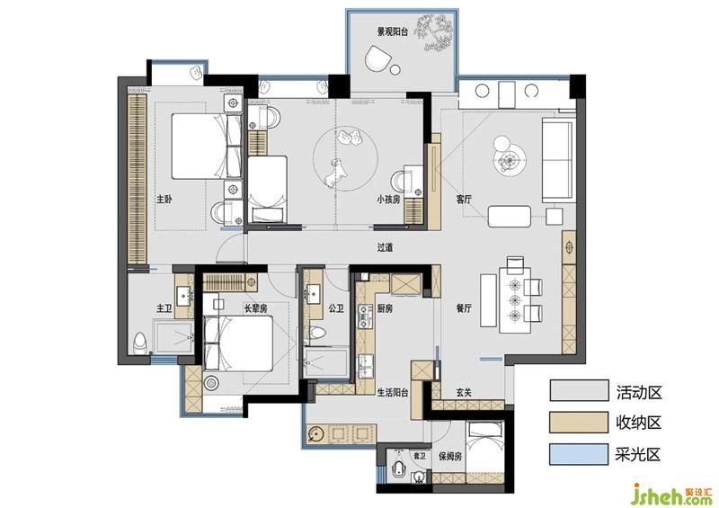 首先:启物把客厅、小孩房、主卧、按照观景的角度设计。