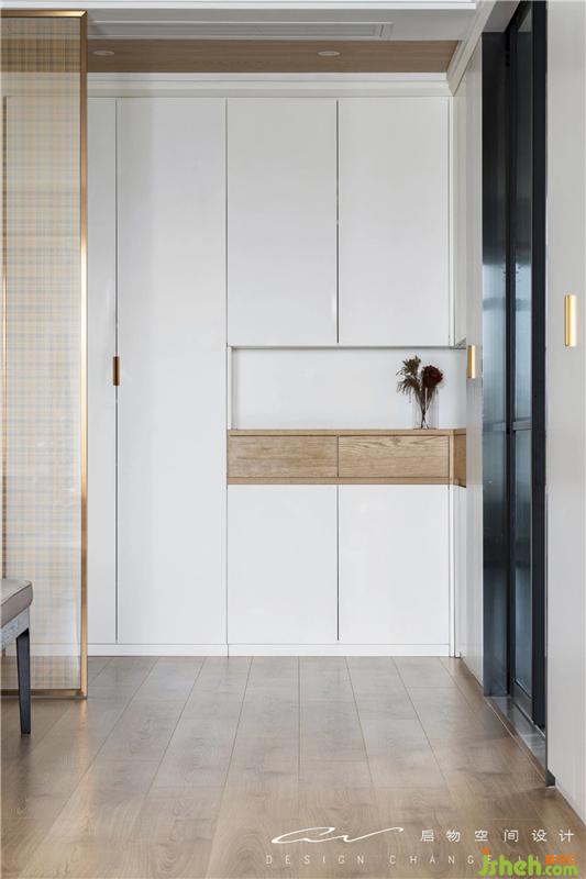 玄关有基本的鞋柜功能。台面可以放钥匙,放快递。抽屉收纳小杂物,材质与天花木皮对应。