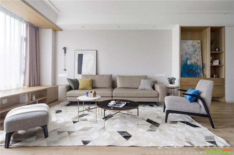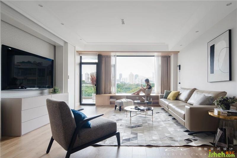 沙发的摆放方便看景。飘窗材质对应天花,木皮材质从室内过渡到窗外的自然。装修设计
