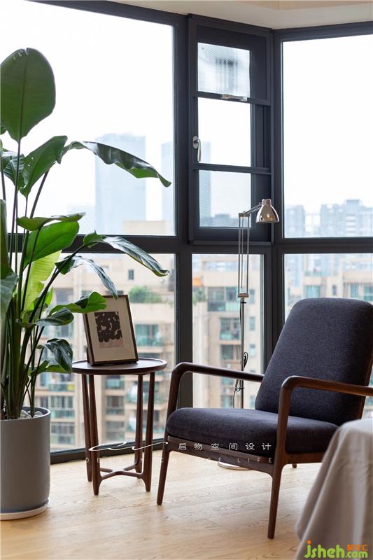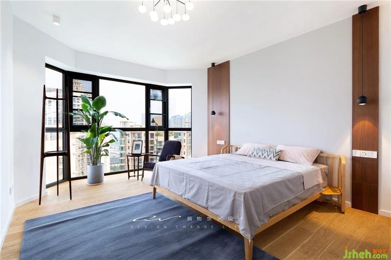 床头,木饰面被灯光照得生动。弧形窗放置绿植,坐在几椅上静静欣赏窗外的风景。装修设计