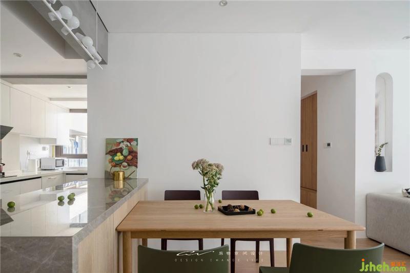 将水泥梁冰冷的材质,对比餐桌木头的凝固的生命。两种材料水火不容碰撞出平衡之美。装修设计