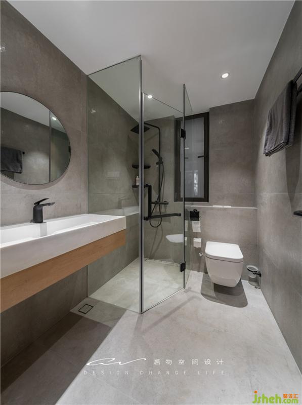在视觉上的简洁启物做了以下努力。淋浴房直接做了高度落差,也在预算上省下大理石挡水条及底板费用。装修设计