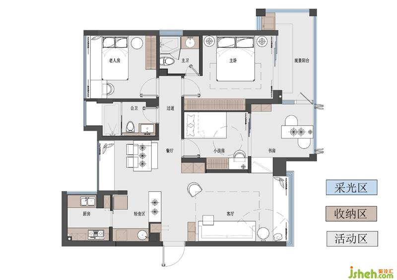 3:电视墙有玄机。左侧做客厅基础收纳柜,中间弯过去做儿童房衣柜,右侧做隐形门,通往儿童房、主卧,一墙多用!看起来会不会很乱呢?造型如下!装修设计