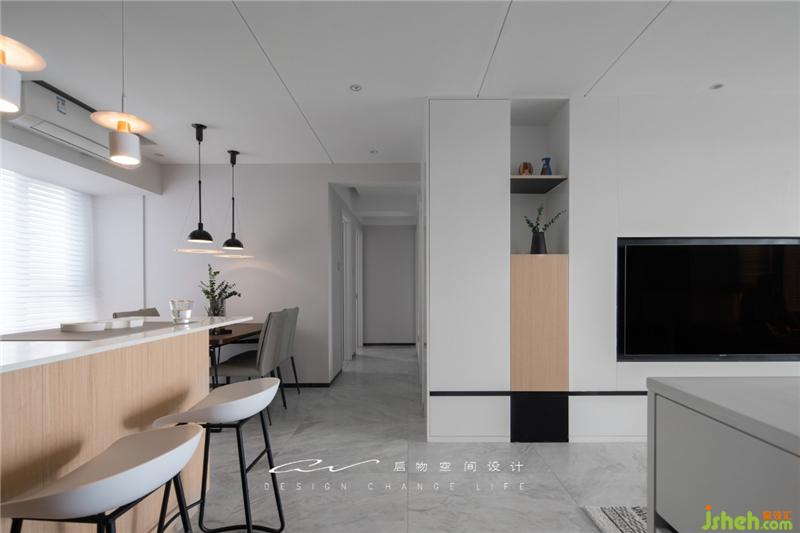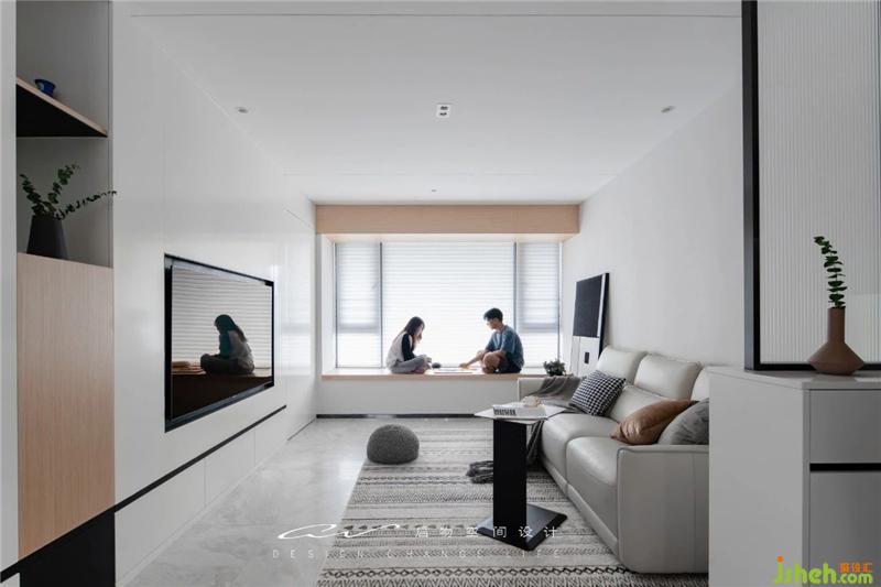 入户第一眼是无压感的空间。白色很难做出层次及距离感,因此小户型慎用!(就像白色裤子谁穿谁胖一样,白色是有膨胀感的颜色。)这里用天花线条拉长视觉纵深,用电视墙做中景拉开距离,做出视觉差异空间才会显大。装修设计