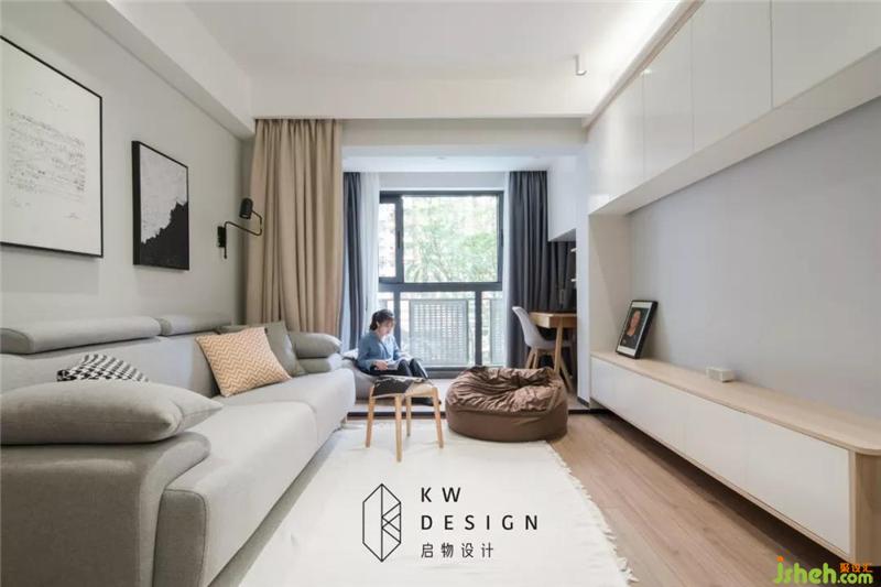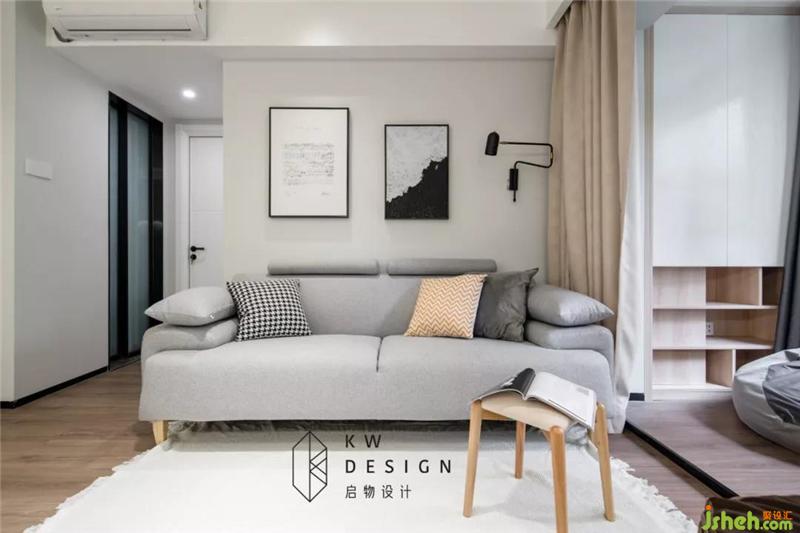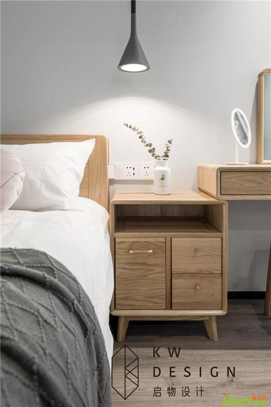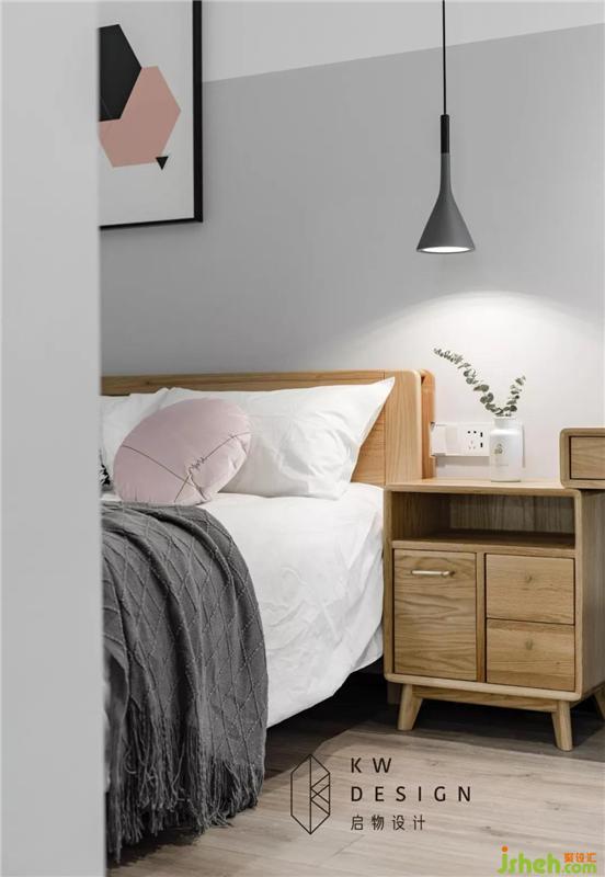 三件家具像是连体一般,和房间严丝合缝,木色家具与水泥吊灯展示裸露的材质的魅力。装修设计