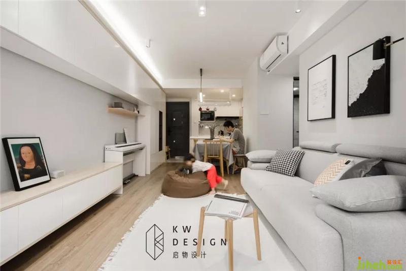 挂机空调隐藏管线,加了一组吊边包住铜管。不规则的柜内空间做切角,柜门也只做上半部分,底下顺手收纳玩具或书籍。装修设计
