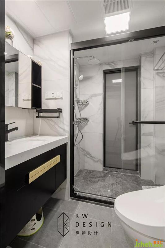 卫生间黑白的配色整洁,这里往外就是生活阳台了,一扇磨砂玻璃门隔绝了凌乱。装修设计