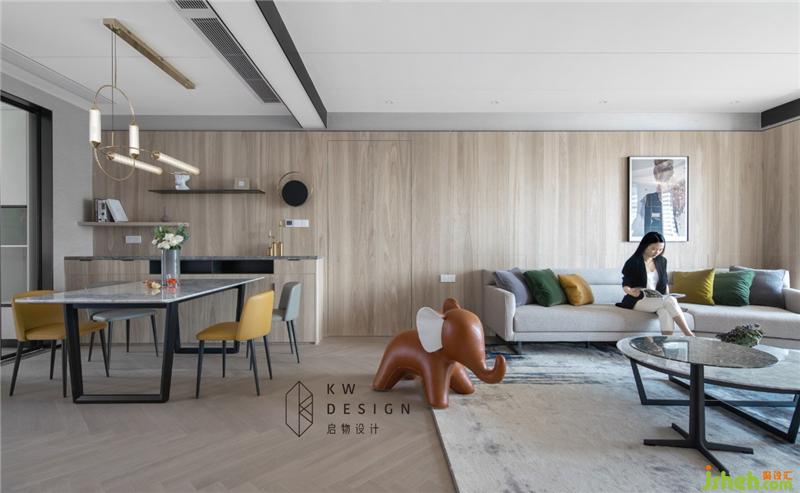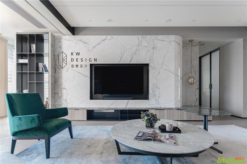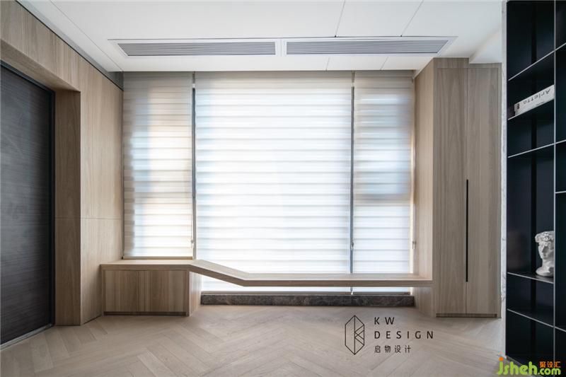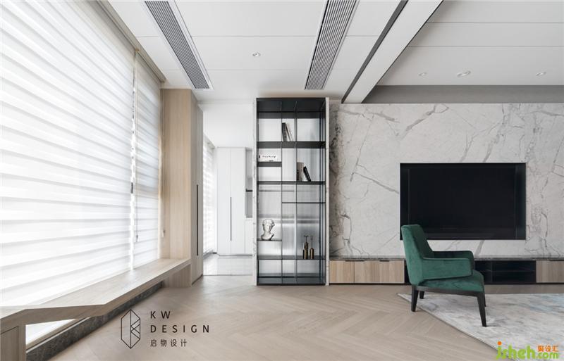 大理石墙与木饰面墙,一冷一暖的材质对比,冲突碰撞出美感。天花抽缝处理,空间进深拉到最大。装修设计