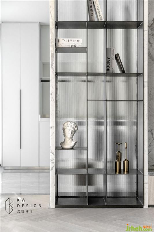 端景柜由启物木工现场制作,再安装不锈钢板(防指纹!),内藏灯带,物件也随着熠熠生辉。装修设计