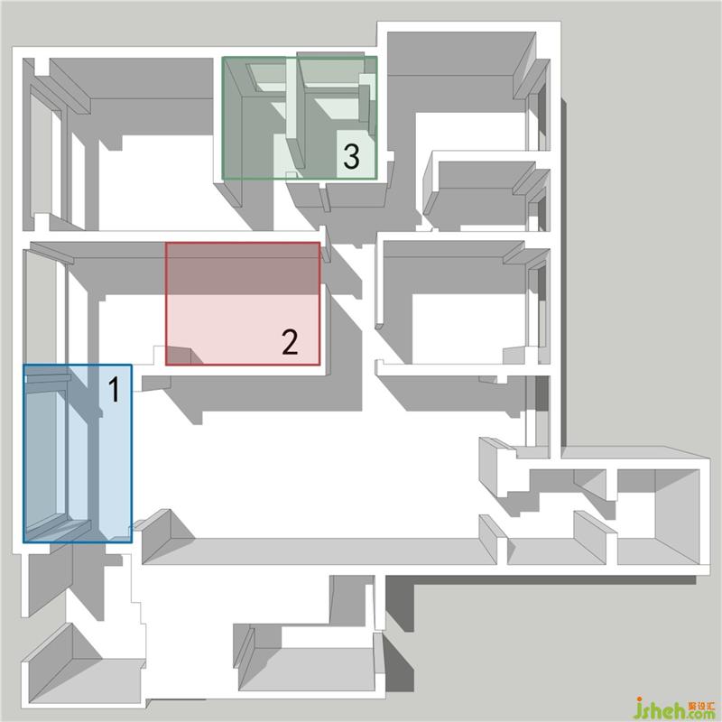 原始图与改造:1:入户花园纳入室内(以上提到的端景柜位置)。改造后客餐厅大气辽阔可跑马。2:四房改三房。次卧改做衣帽间,纳入主卧提升品质感。3:主卧的小衣帽间纳入主卫,屋主收获酒店及高品质(主卫是点睛之笔)。