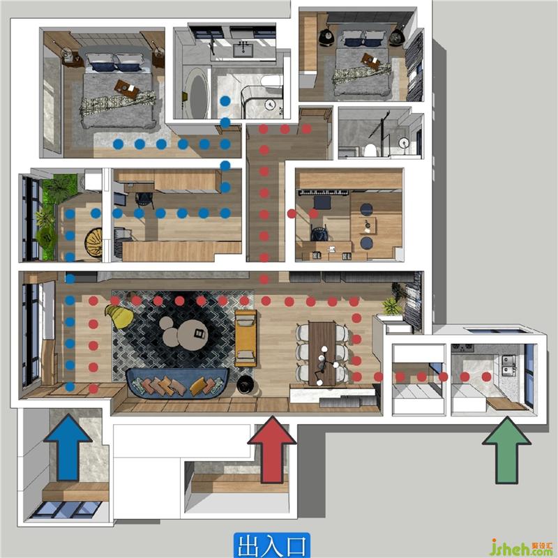 蓝色动线作为上下班动线规划。下班回家更衣、洗漱、睡觉一气呵成。红色动线为家人动线也是主干道,四通八达。绿色箭头的门扇处是逃生通道,守护家人安全。