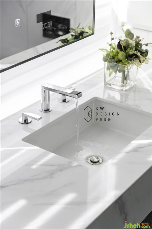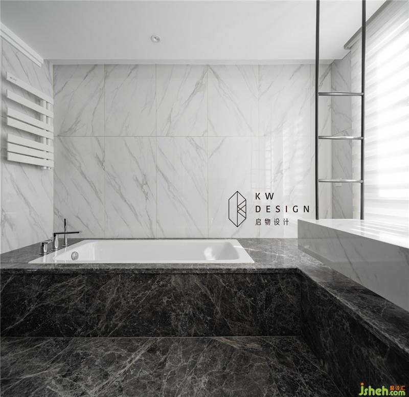 主卫再现牛顿疑惑的空间。浴缸台转角处理干净简洁。轻盈的毛巾梯怎么看都不能承受台面的重量,台面是吊了钢架插在右侧墙上。装修设计