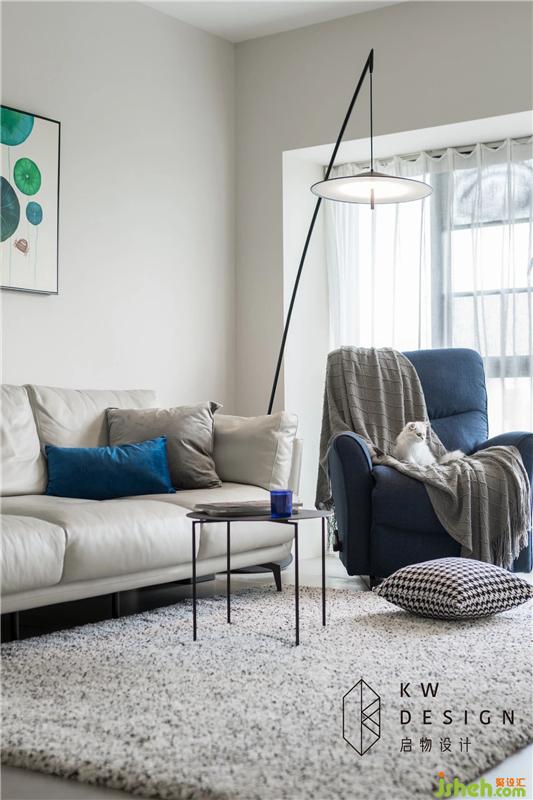 湖蓝色功能沙发满足两位屋主躺着冥想和看书的惬意享受。也是猫咪最喜爱的角落。黑色弧形钓鱼灯与边几互相呼应,线与面,直与弯,构成空间和谐的秩序之美。装修设计