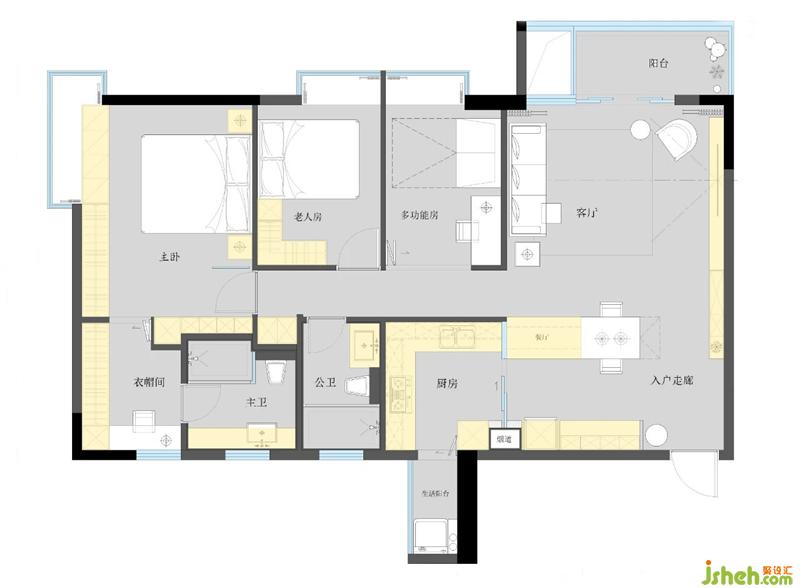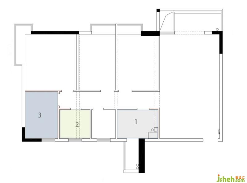 原始户型图非常方正,每个空间布局都有些紧凑。厨房和餐厅利用率很低。做了部分墙体的改动让整个空间动线更合理,收纳利用率最优化。室内设计师