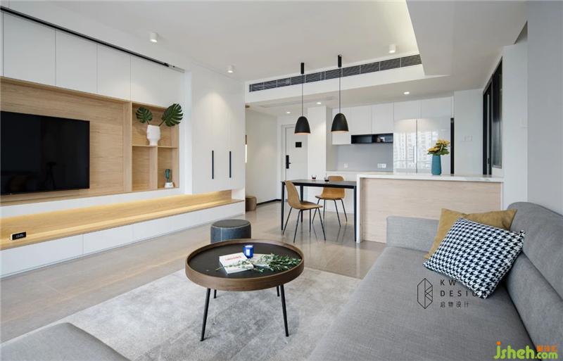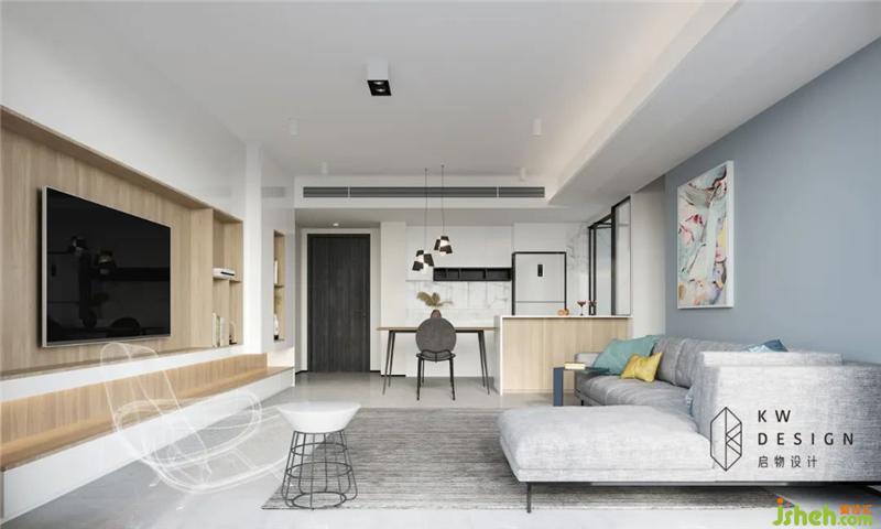 简洁的白、灰色调搭配木质感让空间呈现利落北欧现代风格。