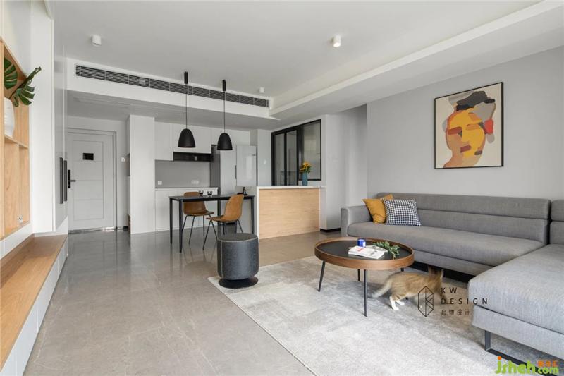 柔光哑面地砖,浅灰色布艺沙发,活动的胡桃木茶几,灰色绒面地毯,耐刮的材料宽敞的空间让猫咪能恣意游走玩耍。室内设计师