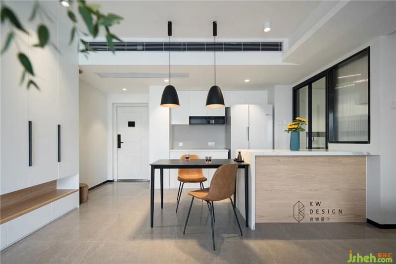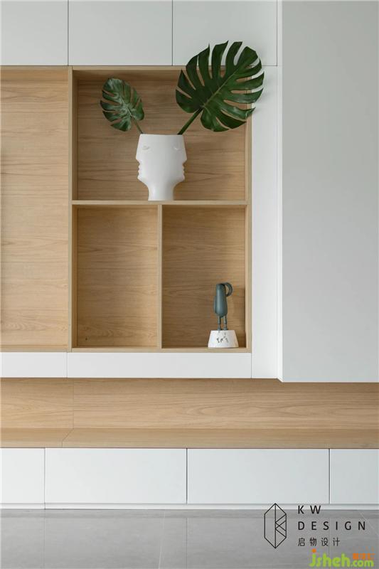 进门左边是到顶鞋柜与餐边柜的结合,餐边柜墙面刷了浅灰色乳胶漆做空间的功能区分,黑色开放格增加了立面层次感。室内设计师