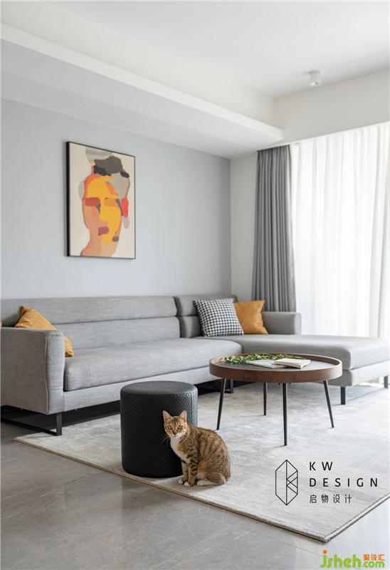中性色彩有效沉淀空间情绪,各种质感的灰,棉麻的,绒面的,织面的,搭配以浅蓝色铺陈的背景,抽象的艺术彩色挂画,为屋主提供了一个舒压明亮的开放空间。