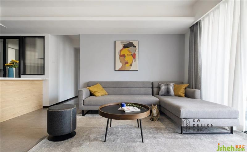 白色窗纱增加了室内空间光影的表现,错层的天花吊顶消弭了低梁的压迫感。灰色L形沙发与地毯织品,增加温润的柔和感。