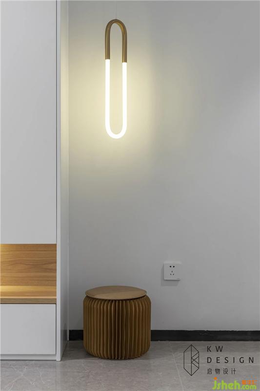 进门处的牛皮折叠圆凳,U型创意吊灯,弱化了电视柜厚度,让通透开阔的休闲空间尽收眼底。