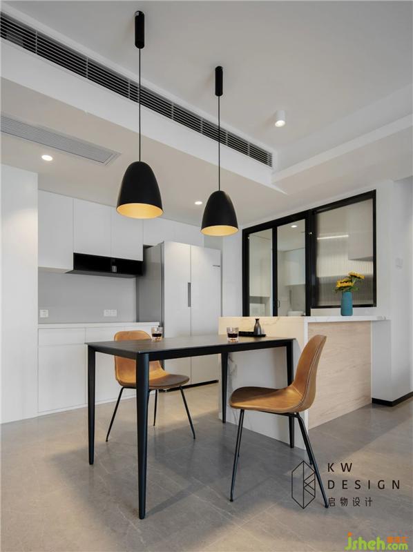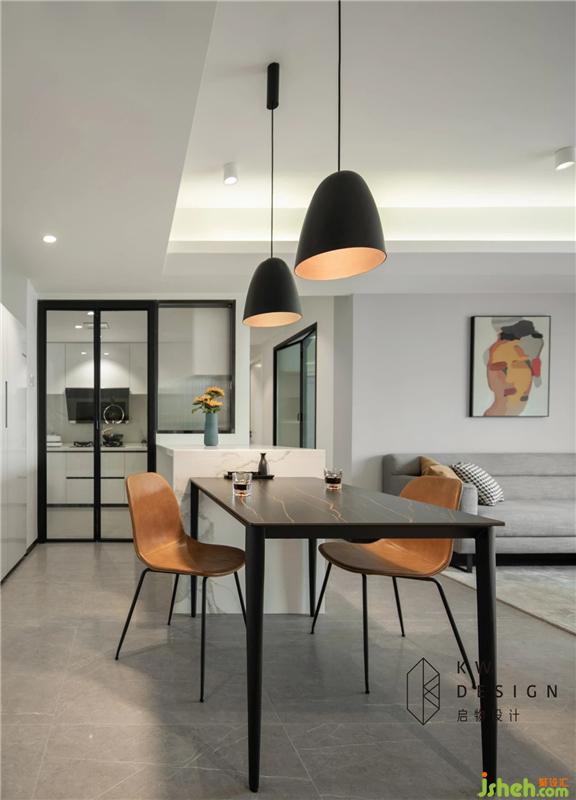 不规则灰色纹理的雪花白岩板吧台,和规则金色纹理的黑色岩板餐桌形成了强烈的视觉对比,棕色皮质餐椅搭配简约黑色吊灯,为热爱生活的主人提供一处满足味蕾和触觉的温馨舒适小天地。室内设计师