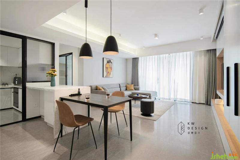 折叠的简约推拉门,方便烹饪工作和进出动线,吧台边上的长虹玻璃窗仿佛是一幅动态的的挂画,模糊的雾面,凹凸竖条纹加上早晚不同的光影效果,呈现出一种微妙的趣味性。这种折射加以延展让简约的空间更具时尚感设计感。