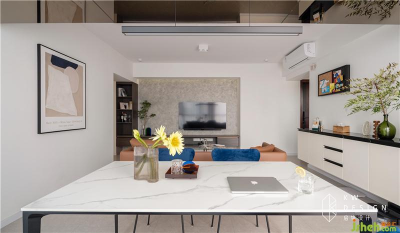 横向的横梁,餐厅横杠细线吊灯,横向的岩板餐桌,横向的沙发从高到低,从前往后延伸,协调有致。