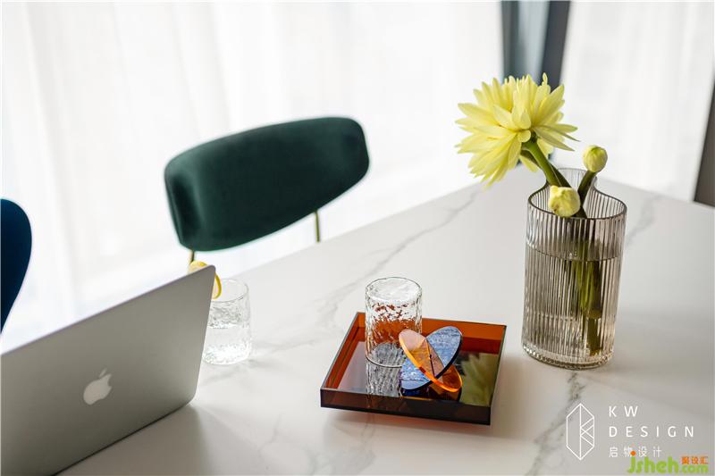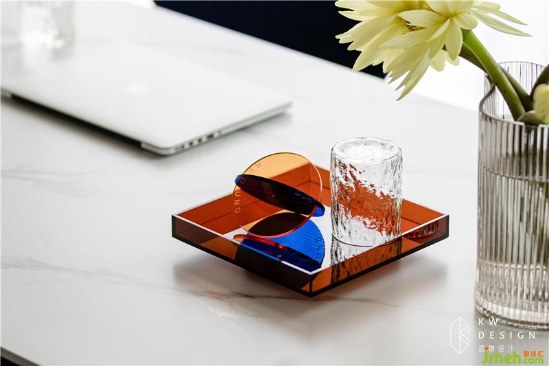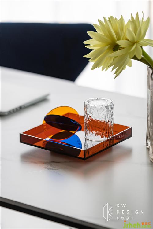 蓝橙鲜亮的茶杯盘,柔嫩鹅黄的绿杆睡莲是空间主色调的小面积补充,更是亮光和哑光碰撞,激发出生活多姿多彩的一面。