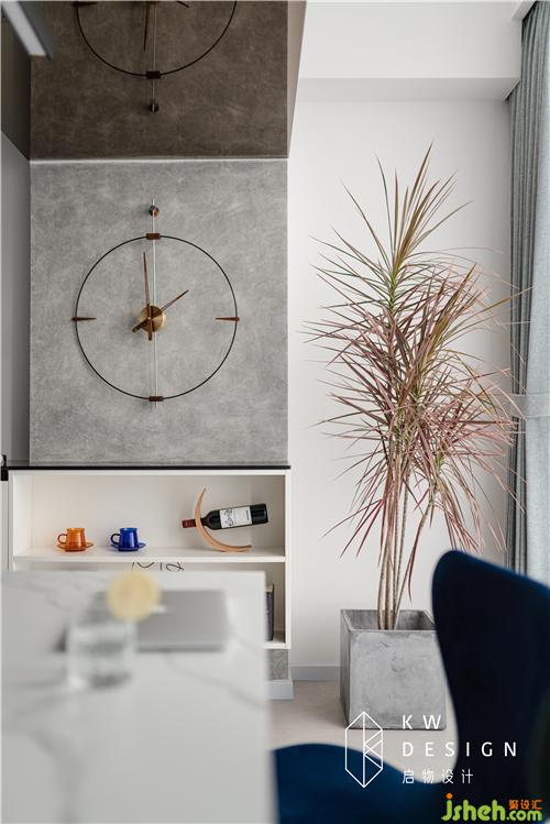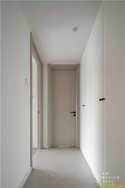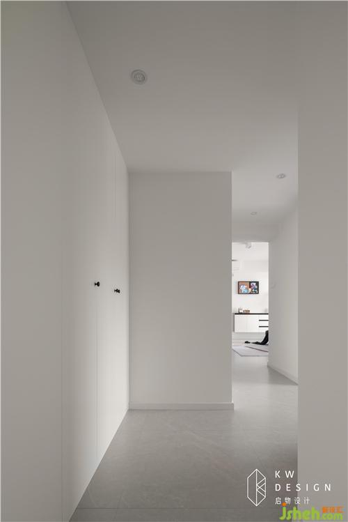 从主卧出来往客厅望去,宽阔狭长的走廊不仅拥有全屋的集中隐藏式收纳柜,而且留白式设计非常具有艺术走廊的美感是室内设计师的最爱。