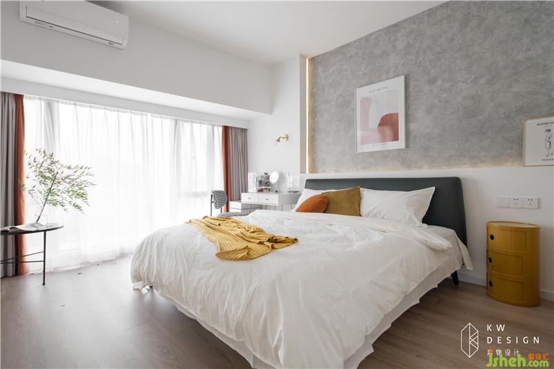 卧室等静区铺的木地板,是出于给予双脚舒适的人性化考虑。主卧配色偏莫兰迪色系,给人低调、朦胧、优雅、温柔之感。