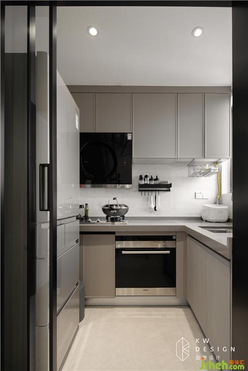 厨房门由原来的650mm扩大为1090mm,改成玻璃推拉门,完善洗炒切功能,流畅动线。小厨房也可以很方便。高级灰简约大气。
